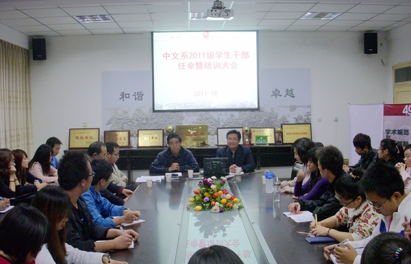 10 月20日 晚,我系在一号教学楼106会议室隆重召开2011年员工干部任命暨培训大会,系主任黄元英出席本次大会并作重要讲话,辅导员赵文英、付栋、李斌、黄璜及2010级系员工干部参加了会议。大会由系党总支书记张彦民主持。