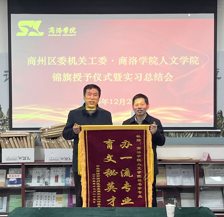 会议伊始,商州区委机关工委向伟德体育官方网站授予锦旗,以此对伟德体育官方网站秘书学专业实习生在实践岗位展现出的专业素养、务实作风和良好精神风貌表示高度认可与诚挚感谢。金红卫和张文诺分别代表各自单位授旗和接旗。